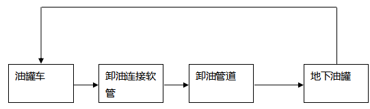 卸油工藝:油罐車行駛至加油站內密封卸油口停車處,利用油罐車與地下儲油罐的高位差,采用密閉式卸油。采用油氣回收系統(tǒng),在油罐車卸油過程中,將原來儲油罐內散溢的油氣,通過油氣回收地下工藝管線及卸車軟管重新收集至油罐車內,實現(xiàn)卸油與油氣等體積置換。其工藝流程如下圖: